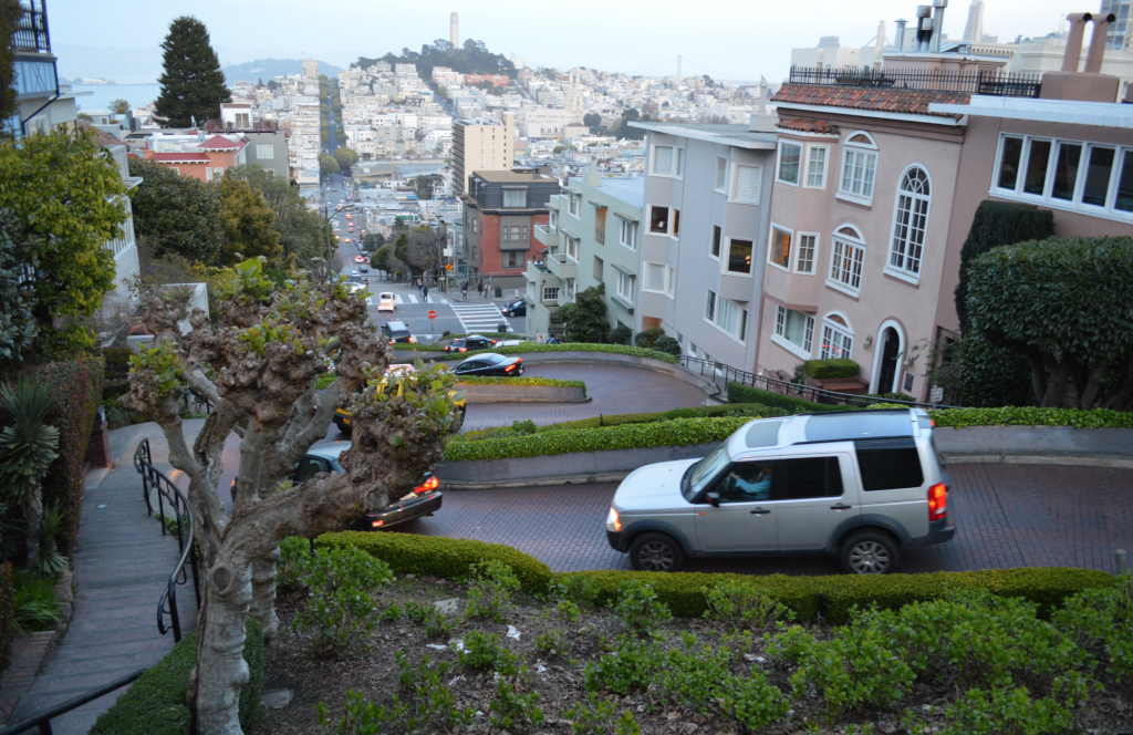 Finalizando, trace uma rota que termine na Lombard Street, conhecida como a rua mais torta (crookedest) do mundo! Em um único quarteirão, ela tem 8 curvas fechadíssimas e um desnível gigante. :)