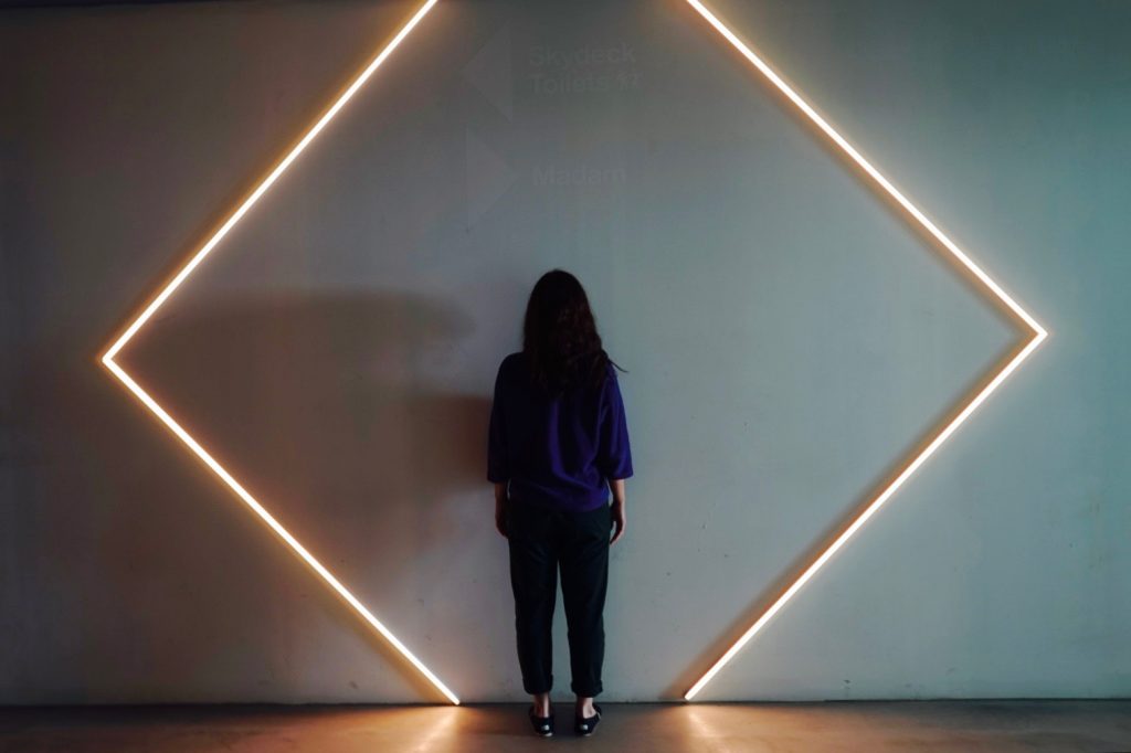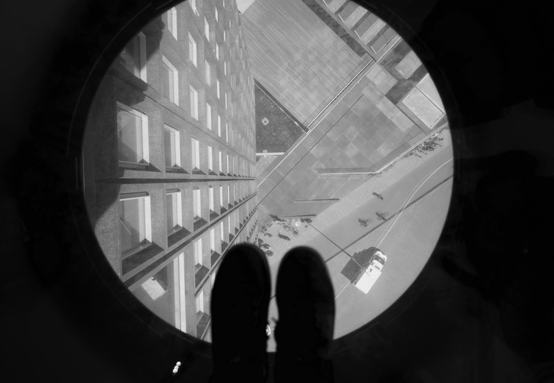 O elevador é a primeira experiência de fato. As portas fecham e os olhos já se direcionam para o teto transparente. É possível avistar o teto final do último andar. Ele sobe os 21 andares em apenas 20 segundos. Um jogo de luz, com formas geométricas projetadas em led, emula uma viagem por um túnel vertiginoso dando a impressão que o elevador está numa velocidade ainda muito superior a que está de fato e de que estamos entrando nos fachos de luzes que vão percorrendo toda a estrutura. A vista do alto é de tirar o fôlego, mas a subida de elevador é de virar os olhos (e o pescoço). A impressão é que você será jogado no céu.