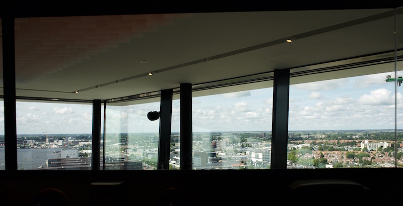 Na saída damos de cara com um corredor com paredes claras e linhas finas de luzes formando três belos cubos, onde não há como resistir e não tirar fotos. Vira-se à direita e finalmente estamos na área fechada do Adam Lookout. Toda a parede lateral é de vidro com certa profundidade, dando a impressão que vamos cair do prédio. O fascínio cresce ao perceber como Amsterdã é tão bela do alto quanto do chão. Na frente o grande canal, que separa a estação central da região onde estamos. No chão, um grande círculo transparente causa vertigem em quem olha. Alguns não se atrevem. Dali se vê a calçada abaixo dos seus pés, pois este último andar se sobrepõe ao prédio abaixo. Entre o prédio e esse cubo, há um andar redondo, onde funciona o novo restaurante Moon, que gira lentamente, proporcionando os 360º de visão da cidade sem precisar sair do lugar.