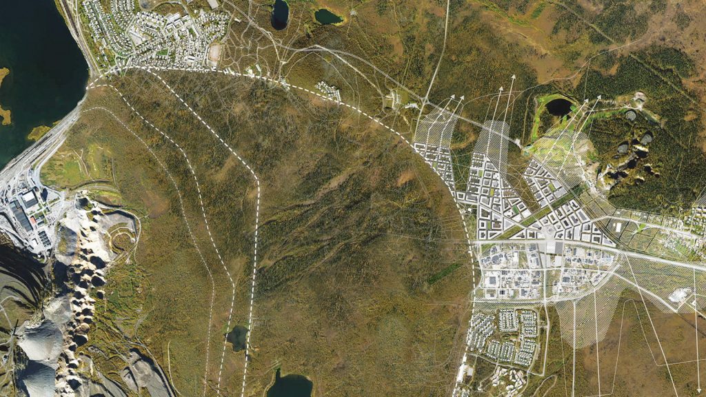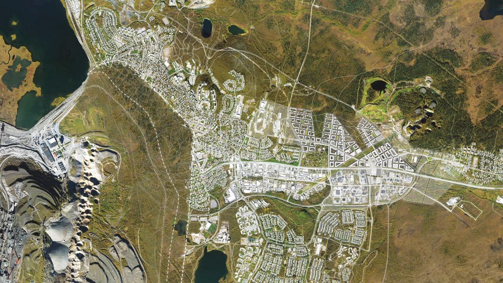 O masterplan da mudança foi projetado pelo White Architects, um dos escritórios de arquitetura de mais prestígio no país, enquanto outras empresas assumiram aspectos menores. A praça central foi desenhada pelo Kjellander + Sjöberg. O bairro será menor que o existente, e vai para o canto oposto da cidade, longe da mina. O novo layout deve corrigir alguns problemas atuais, como o espraiamento, que faz com que a população, apesar de reduzida, tenha que se deslocar grandes distâncias para chegar ao centro ou às paisagens do subúrbio. A nova configuração deve ser bem mais friendly para os pedestre. Muitas das ruas serão mais estreitas, oferecendo proteção contra o vento. Lojas, cafés e a prefeitura serão reagrupados, fazendo a circulação mais amigável durante os meses frios e escuros do inverno. O acesso à natureza é facilitado pelo desenho em zigzag dos limites da cidade, fazendo línguas de floresta cortarem em direção ao centro.