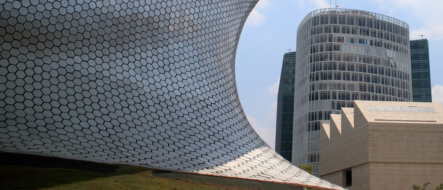 Exatamente ao lado, e contrastando violentamente na forma, fica o icônico Museo Soumaya. Suas curvas sinuosas criam a volumetria de uma ânfora, inteiramente revestida de placas hexagonais de alumínio, sem a abertura de uma janela sequer. O arquiteto mexicano Fernando Romero optou por deixar toda a iluminação natural e a ventilação virem da cobertura. Por dentro, o espaço expositivo contínuo serpenteia pelos seis andares do museu. Na construção, estiveram envolvidos também Ove Arup e Frank Gehry.