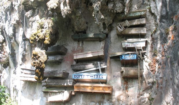 Em Sagada, nas Filipinas, a tradição dos cemitérios suspensos, onde os caixões de seus mortos são pendurados em penhascos, presos apenas por cordas e correntes, viraram até ponto turístico. Segundo as crenças da tribo Igorot, a alma precisa de lugares de muita tranquilidade para conseguir descansar em paz. Ainda segundo os Igorots, se os caixões forem pendurados, os espíritos vão conseguir fazer um caminho muito mais tranquilo em direção Deus Kabunian. E também dão uma mãozinha para o turismo local, obviamente!