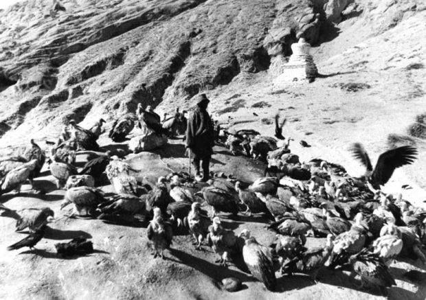No Tibet, a tradição de não enterrar seus mortos pode ser até bem chocante para nós ocidentais. Muitos tibetanos, especialmente os budistas, tem costume de cortar o corpo em pedaços e os deixar no alto das montanhas para que os pássaros se divirtam. Mas tá tudo, bem! Os budistas vêem cadáveres apenas como vasos vazios, e consideram esses enterros no céu como um ato de caridade e compaixão com os animais, uma vez que aquilo ali é apenas carne. Para nós ocidentais, isso parece bem assustador!