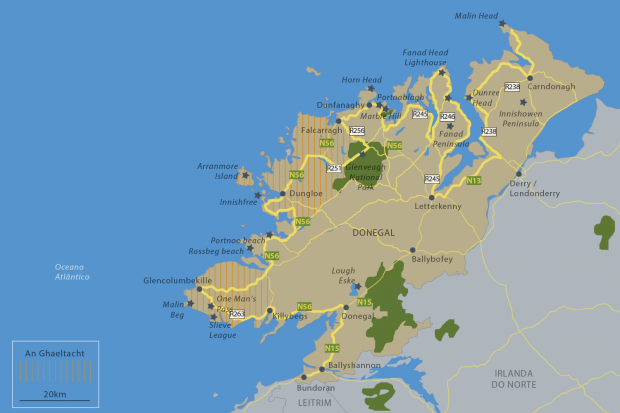 E nenhum lugar é melhor do que Donegal para fechar este roteiro com chave de ouro. O condado de Donegal fica no extremo norte da ilha, apertadinho entre a Irlanda do Norte e o mar. A sua geografia física e política contribuem para um certo isolamento, garantindo a Donegal características muito próprias e “extremamente irlandesas”. No bom sentido, claro. Aliás, no melhor dos sentidos.