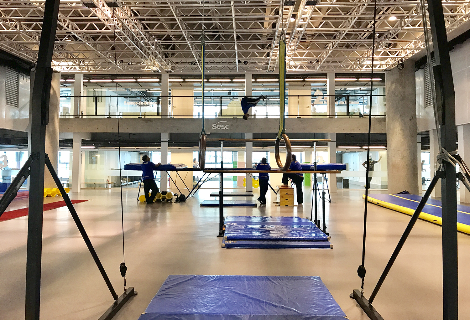 Dentro dessa lógica, cada andar recebeu uma função, abarcando um programa bem variado. O espaço destinado a clínicas de odontologia (7º) fica logo abaixo do grande vão destinado a esportes (8º) de mais de 5m de altura, com parede de escalada e camas elásticas. O 5º pavimento é um vão livre para exposições, que pode ser dividido e redividido, de acordo com as mostras que receber. E dentro de todas essas funções, dois andares inteiros foram deixados para funcionarem como verdadeiras praças elevadas. O 3º tem um espaço de convivência mais integrado com a cidade, com bancos, poltronas e mesas, e no 11º parece um simulacro de jardim tem espelhos d’água, uma cafeteria, uma abertura zenital para o meio da piscina, e uma bela vista do skyline da cidade.