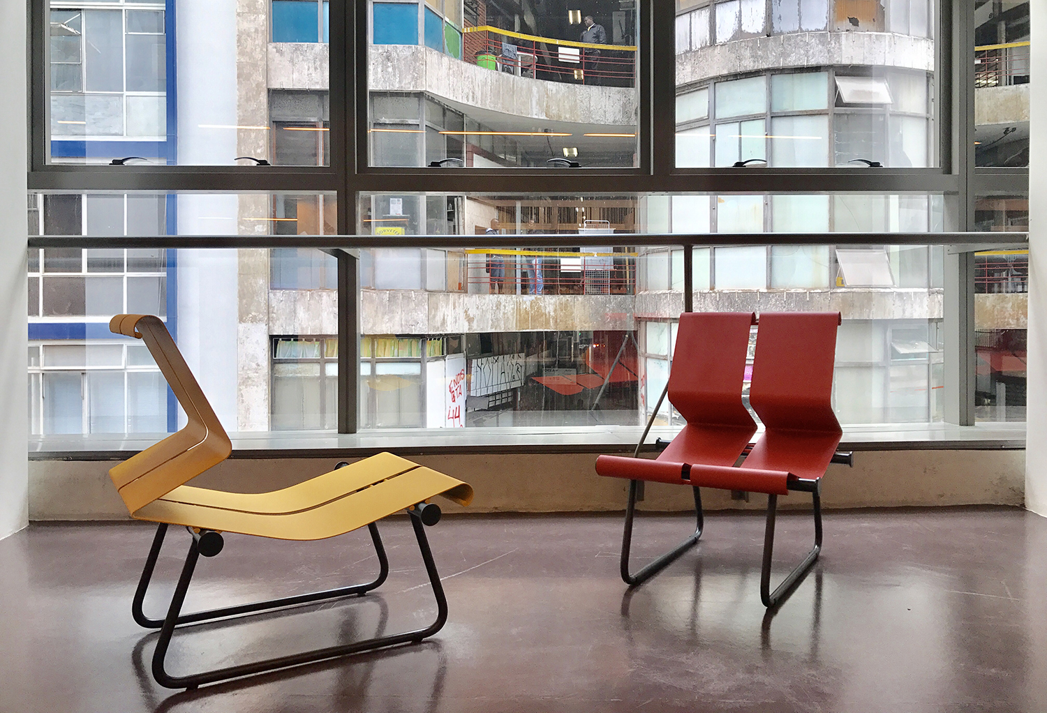 Mas nem tudo é só cinza. O mobiliário do Sesc 24 de Maio foi todo desenhado também por Paulo Mendes. Os bancos, cadeiras e poltronas espalhados por todos os andares são feitos por chapas metálicas curvadas e pintadas em tons não óbvios de azul, amarelo, verde e vermelho. Esse mobiliário exclusivo humaniza todo o concreto. Mas na minha opinião deixou a Comedoria ainda um pouco fria, se comparada a outras unidades. A única coisa que alegra um pouco o espaço das refeições é o grande painel ‘Inventário’ da artista Regina Silveira.