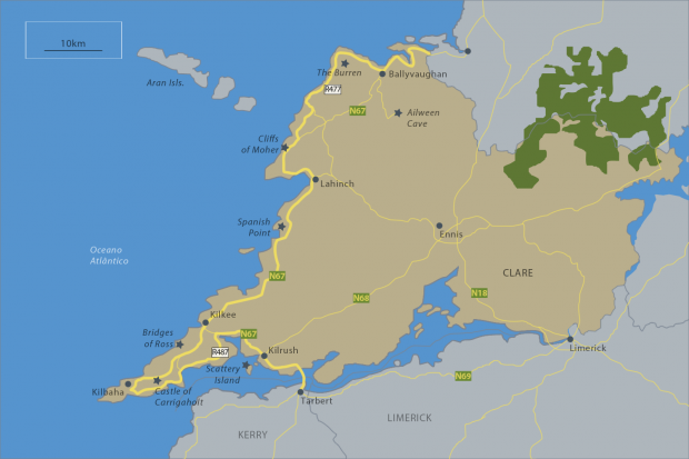 Atravessando o maior rio da Irlanda, a beleza inconfundível dos mundialmente famosos Cliffs of Moher – e de muitos outros cliffs – em county Clare; e mais, cultura, ilhas, fiordes e castelos de contos de fadas em county Galway.