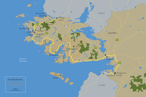 Seguindo viagem, o trecho compreendido entre Galway City até a próxima principal parada em Clifden abriga a maior e mais importante região de An Gaeltacht de toda a Irlanda. Dica: apesar do caminho entre Galway e Clifden ser menor pela estrada regional N59, prefira ir pelas estradas locais R336 e R340, que contornam a retorcida linha do litoral. O caminho fica mais longo, mas também é muito mais bonito e o percurso passa todo por dentro da região An Ghaeltacht. Então prepare-se para parar em pubs no meio do caminho e experimentar o mais genuíno da hospitalidade irlandesa.