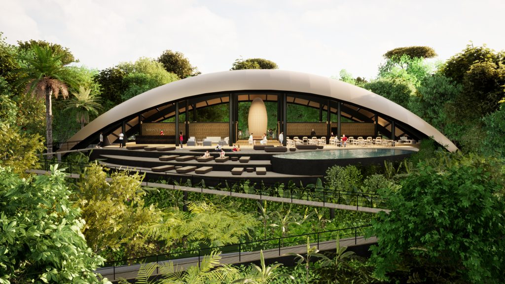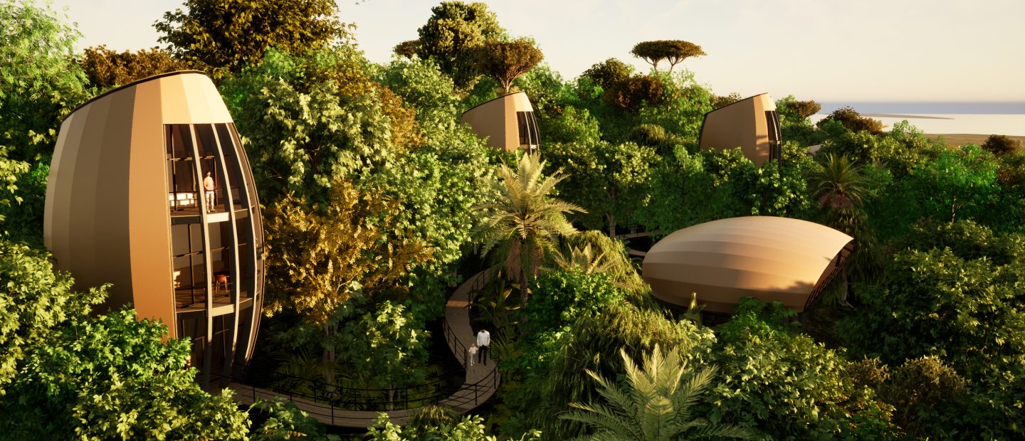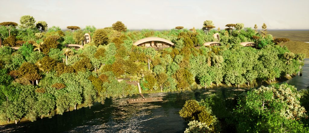 O complexo turístico é composto por estruturas independentes baseadas em elementos naturais e culturais da região, interligados por passarelas elevadas, ocupando o espaço de forma orgânica, respeitando a topografia do terreno e a vegetação existente. Os módulos que abrigam os quartos mimetizam as sementes encontradas no Rio Negro. ‘Na natureza, encontramos várias espécies de sementes e fascinam as que contêm outras e outras, numa abundância e camadas de penetração na essência da vida, a qual cria condições para a vida’, resume Brajovic.